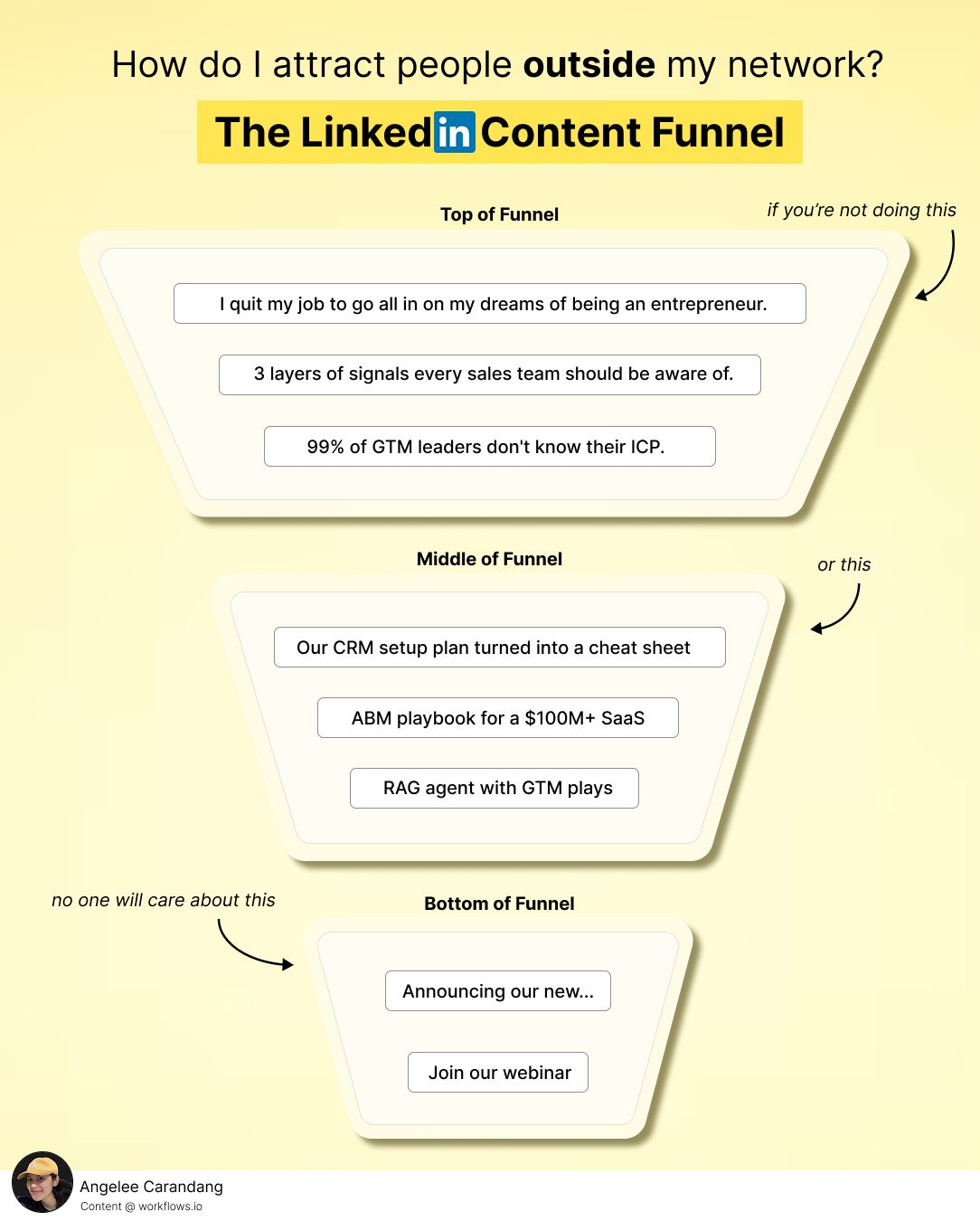 TOFU (Top of Funnel) posts are your discovery engine. Stories, opinions, resource lists, behind-the-scenes moments. The goal is reach. Get in front of people who've never seen your name.
