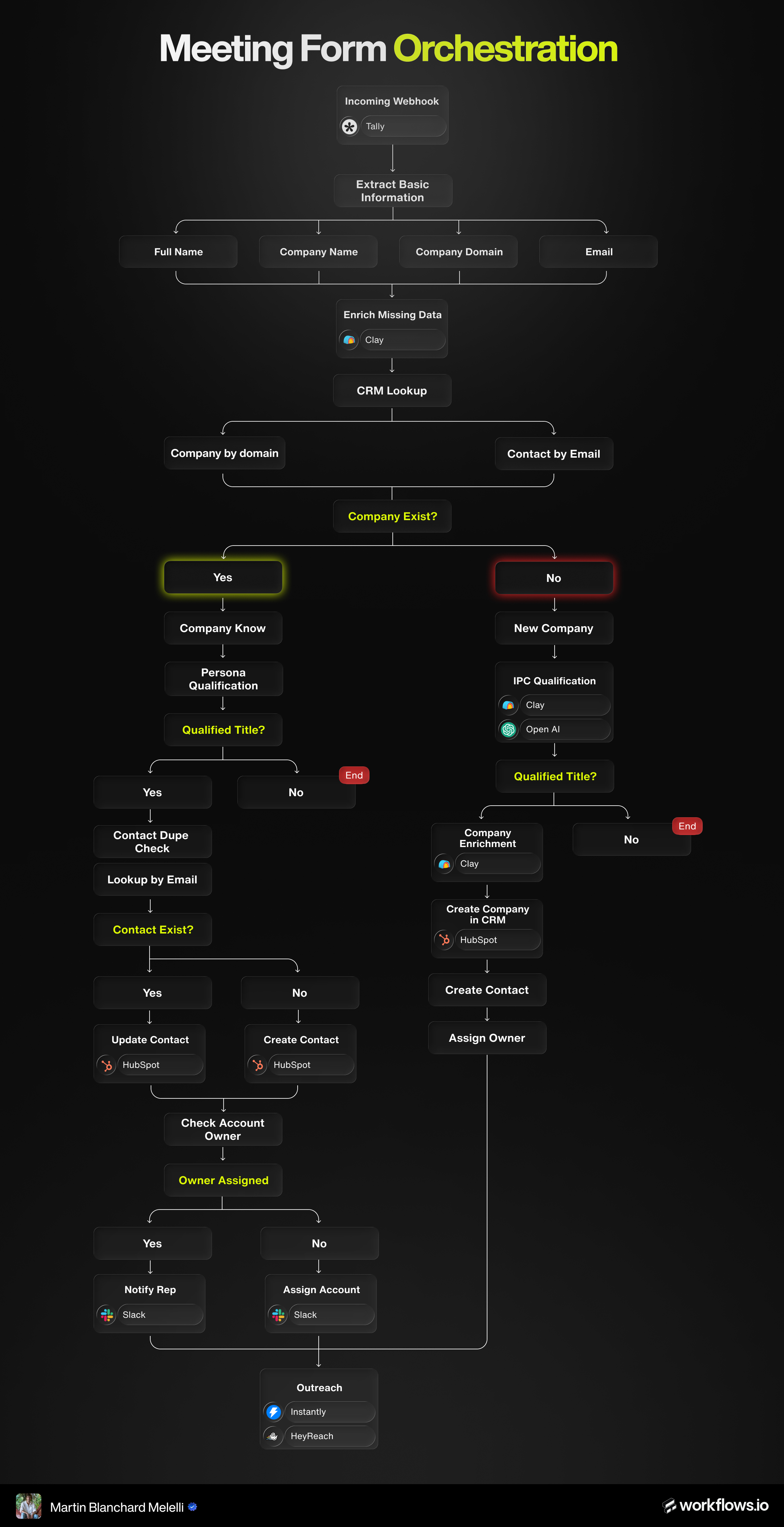 This workflow capture meeting form submissions, enrich and qualify contacts, sync them with the CRM, and automatically route qualified prospects to the right sales rep for outreach.